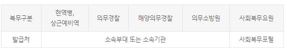 해당 서류는 병무청 또는 자신이 현재 복무중인 소속 부서로부터 본인이 직접 신청하여 발급하시면 됩니다.