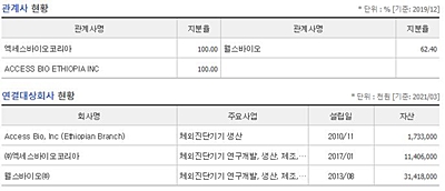 엑세스바이오는 자회사인 엑세스바이오 코리아/에티오피아 지분 100%, 그리고 웰스바이오의 지분 62.4%를 보유하고 있습니다.