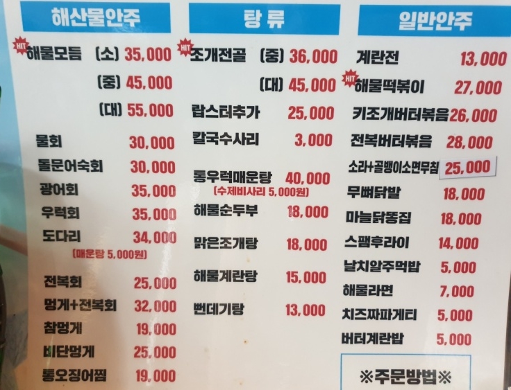 이제 보니 물회, 광어회, 우럭회, 전복회 등등 회 종류도 참 많네요. 회도 먹어볼걸. 랍스터 추가도 되고... 닭발도 있고. 갑자기 메뉴판을 보니까 배가 고프네요.ㅠㅠ ㅎㅎ