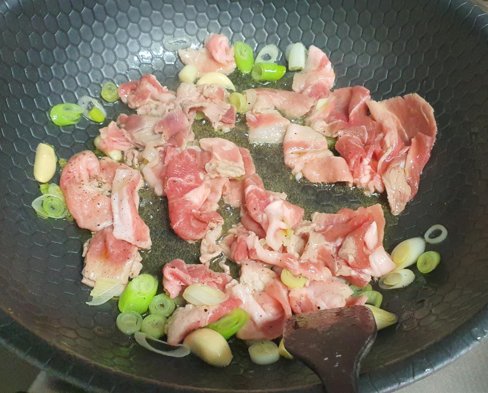 2. 기름에 파 향이 배면 한입 크기로 썰어놓은 돼지고기를 넣고 볶아 익힌다. (이 때 잡내 제거를 위해 후추 뿌리기)