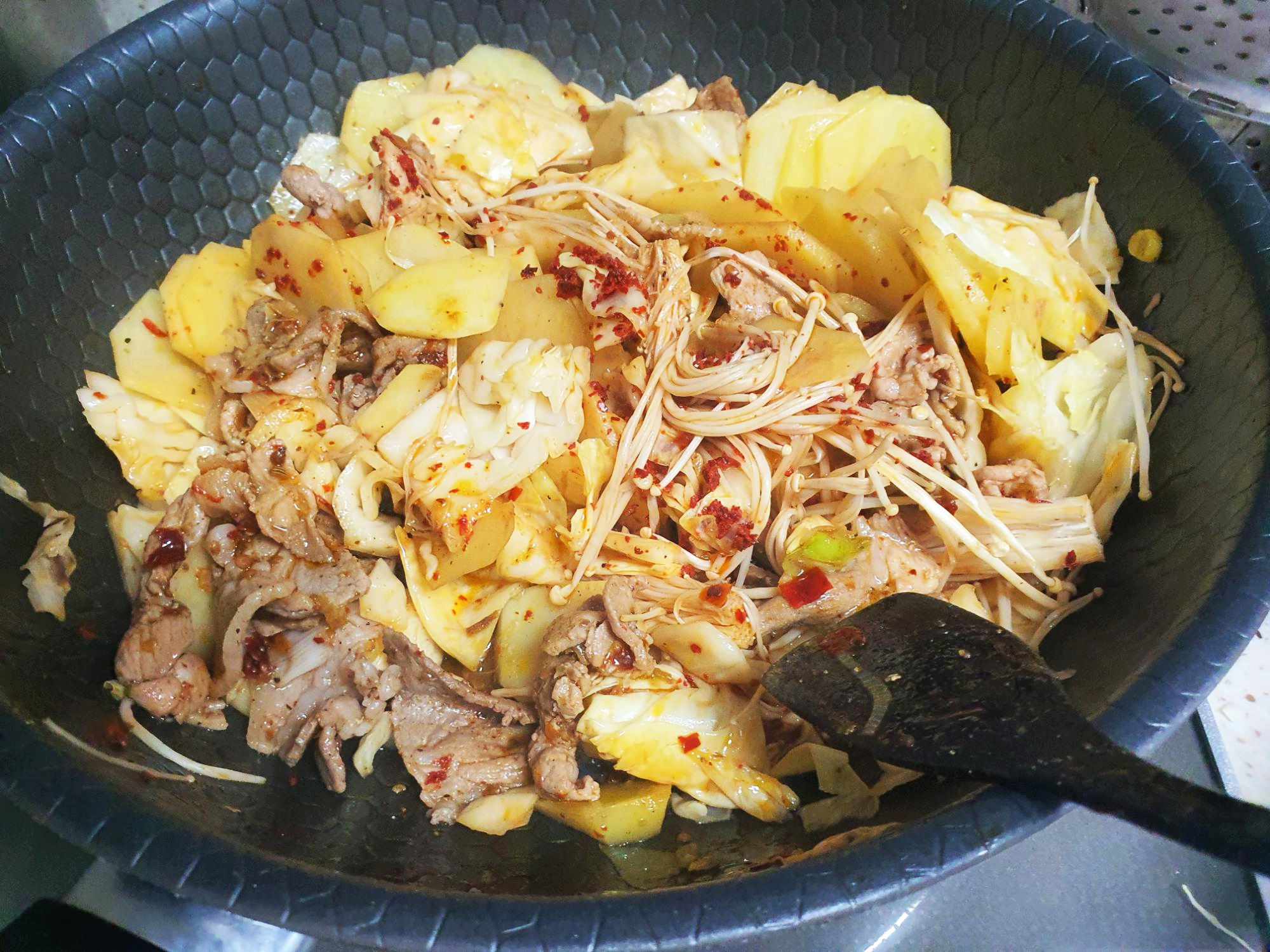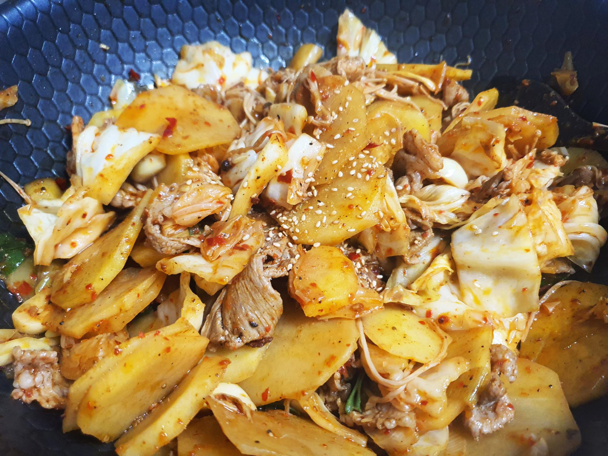 ※ 단단한 채소류(양배추, 감자)는 조리 전 끓는물에 데쳐서 숨을 죽이고 익혀주어야 맛이 더 좋아요. 귀찮으면 한꺼번에 같이 볶아도 되지만 그러면 볶을때 수분이 빠져나와 간이 싱거워지고 맛이 덜 해서 따로 데치는 걸 추천드려요.