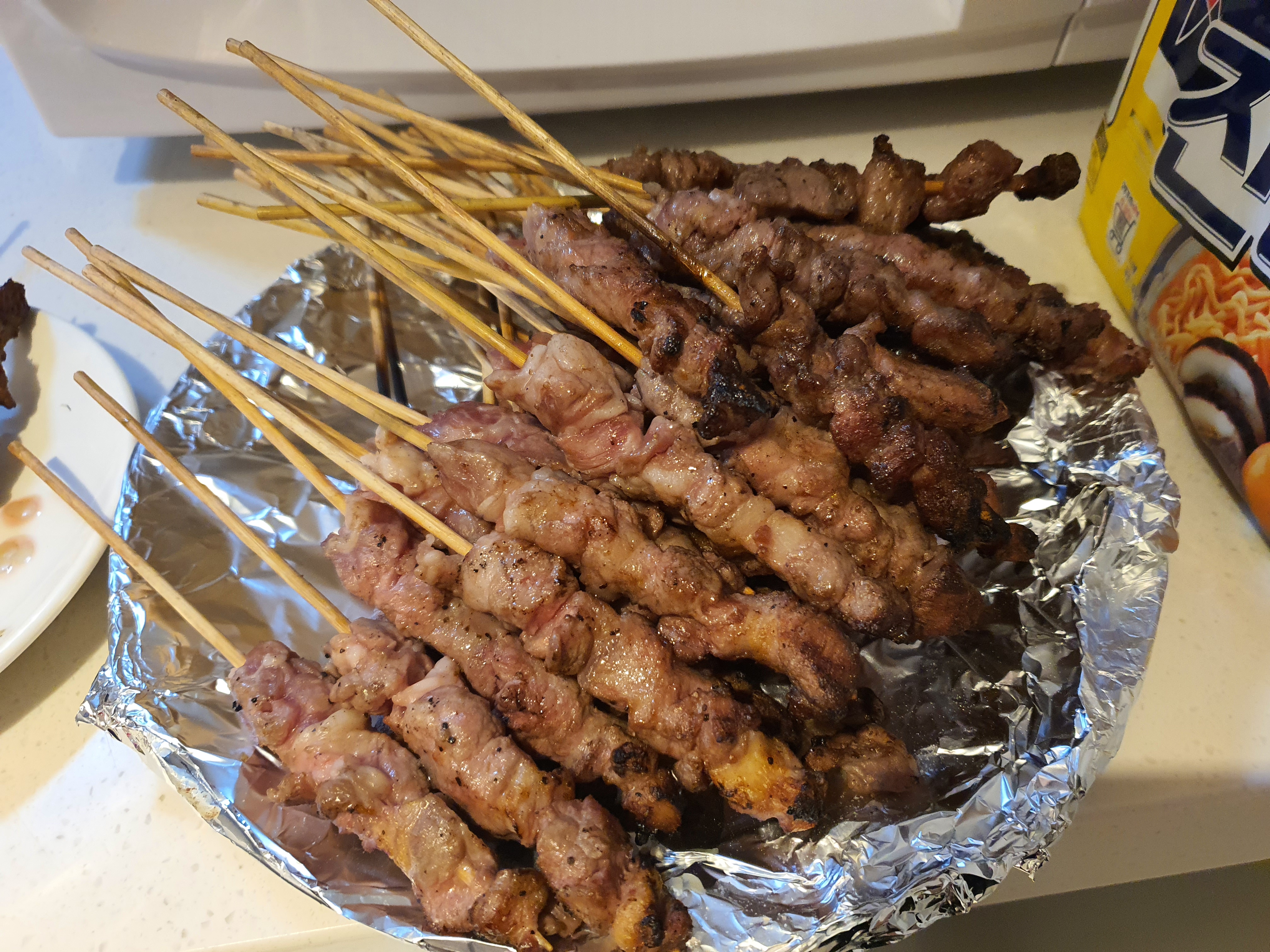 맛은 있는데 굽는게 너무 힘들었다는... 결국 초벌로 굽고 숙소 안에서 후라이팬으로 바짝 익혀 먹었습니다. 양꼬치는 식당에서 사먹는게 최고... 자동으로 구워주는 기계가 최고...