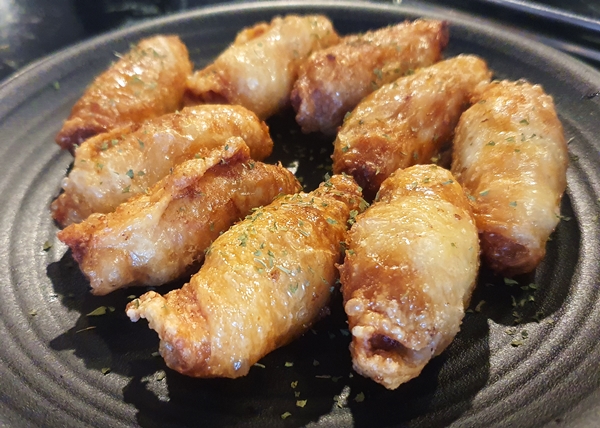 닭고기를 다져 닭껍질 안에 넣고 튀긴 닭껍질 튀김만두입니다.