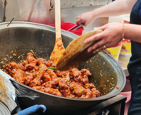 쉴새없이 닭강정을 버무리고 있던 소문난 맛집...!
