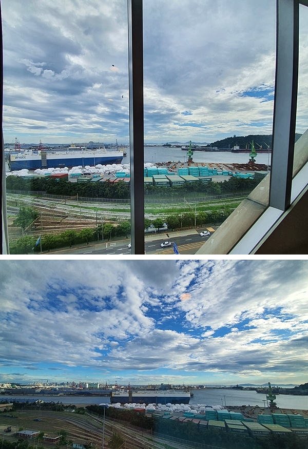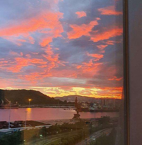 저희 호텔방 뷰입니다. 인천항 뷰! 바다 위에 떠 있는 화물선과 컨테이너가 보이는 색다른 풍경입니다.