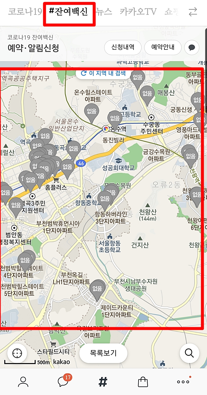 상단에 보시면 #잔여백신 이라고 되어있는 것을 누르신 후 자택이나 회사 근처로 설정하신 뒤 노쇼백신이 남은 곳을 찾으시면 됩니다.