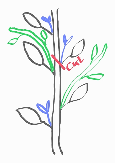 그림에서는 회색 줄기가 어미순이고, 파란색 줄기는 어린 곁순(=아들순), 초록색 줄기가 어느 정도 자란 곁순(=아들순) 입니다.
