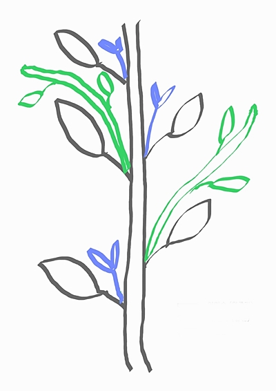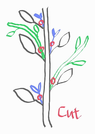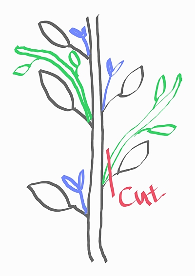 그림에서는 회색 줄기가 어미순이고, 파란색 줄기는 어린 곁순(=아들순), 초록색 줄기가 어느 정도 자란 곁순(=아들순) 입니다.