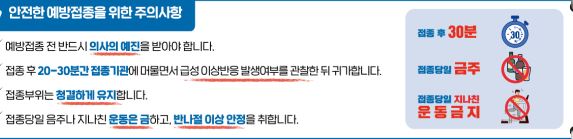 또한 접종 후 20~30분 동안은 접종 병원에 머물며 급성으로 이상반응이 오는지를 관찰한 뒤 이상이 없는 경우에 귀가하여야 합니다.