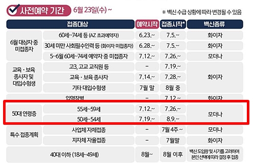 7월 19일부터는 50~54세(1967년~1971년 출생자) 및 모든 50대를 대상으로 사전예약을 실시합니다.