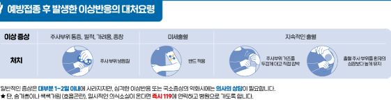 주사부위의 통증, 가려움, 빨갛게 부어오르는 증상이 있는 경우에는 접종부위에 얼음팩이나 차가운 음료수 캔을 대어 냉찜질을 해주시면 한결 나아집니다.