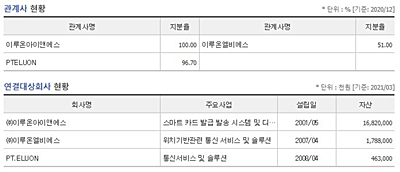 이루온아이앤에스 지분율 100%, 이루온 엘비에스 지분율 51%, PTELUON 96.70%