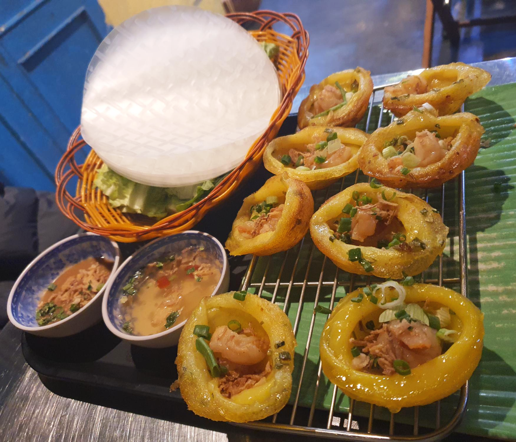 월남쌈처럼 먹으면 되는데요. 라이스페이퍼 안에 상추를 넣고 그 위에 저 동그란 타르트를 넣습니다. 그리고 느억망 소스를 흠뻑 뿌린 뒤 접습니다. 그 후 기호에 따라 땅콩 소스를 찍어서 한 입에 넣거나, 또는 베어먹으면 되는데요.